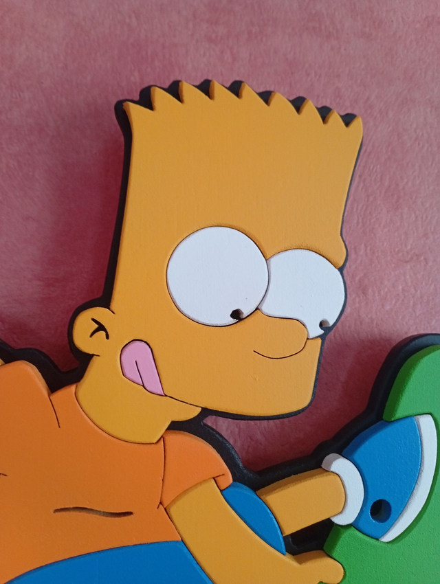 Bartholomew JoJo Simpson, plus connu sous le nom de Bart Simpson, est apparu en 1987, deux ans avant la série devenue mythique "Les Simpsons". Ce personnage, véritable star dès ses premières apparitions, jusqu'à produire une Bartmania, continue d'être un des personnages phares de la série. Fan de skateboard, il est représenté ici dans l'une de ses figures habituelles, et en tirant la langue.